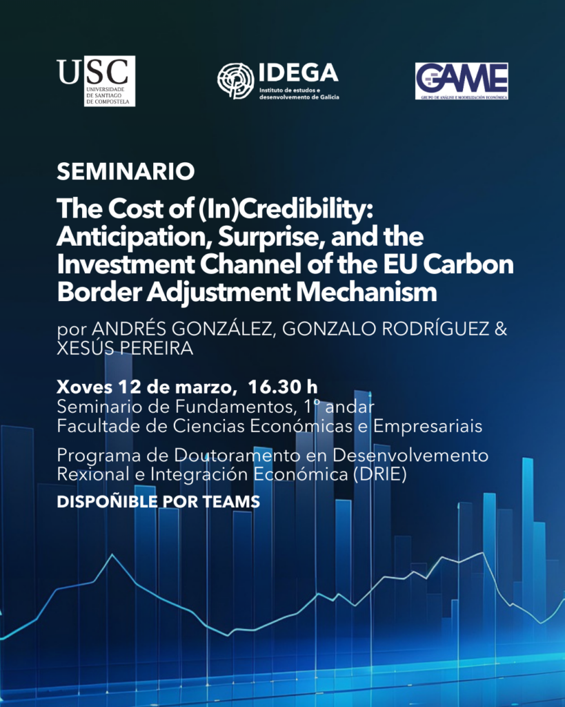 O seminario do Programa de Doutoramento en Desenvolvemento Rexional e Integración Económica (DRIE) desta semana terá lugar o xoves 12 de marzo ás 16.30 h. Leva por nome “The Cost of (In)Credibility: Anticipation, Surprise and the Investment Channel of the EU Carbon Border Adjustment Mechanism” e será impartido por Andrés González, Gonzalo Rodríguez e Xesús Pereira.