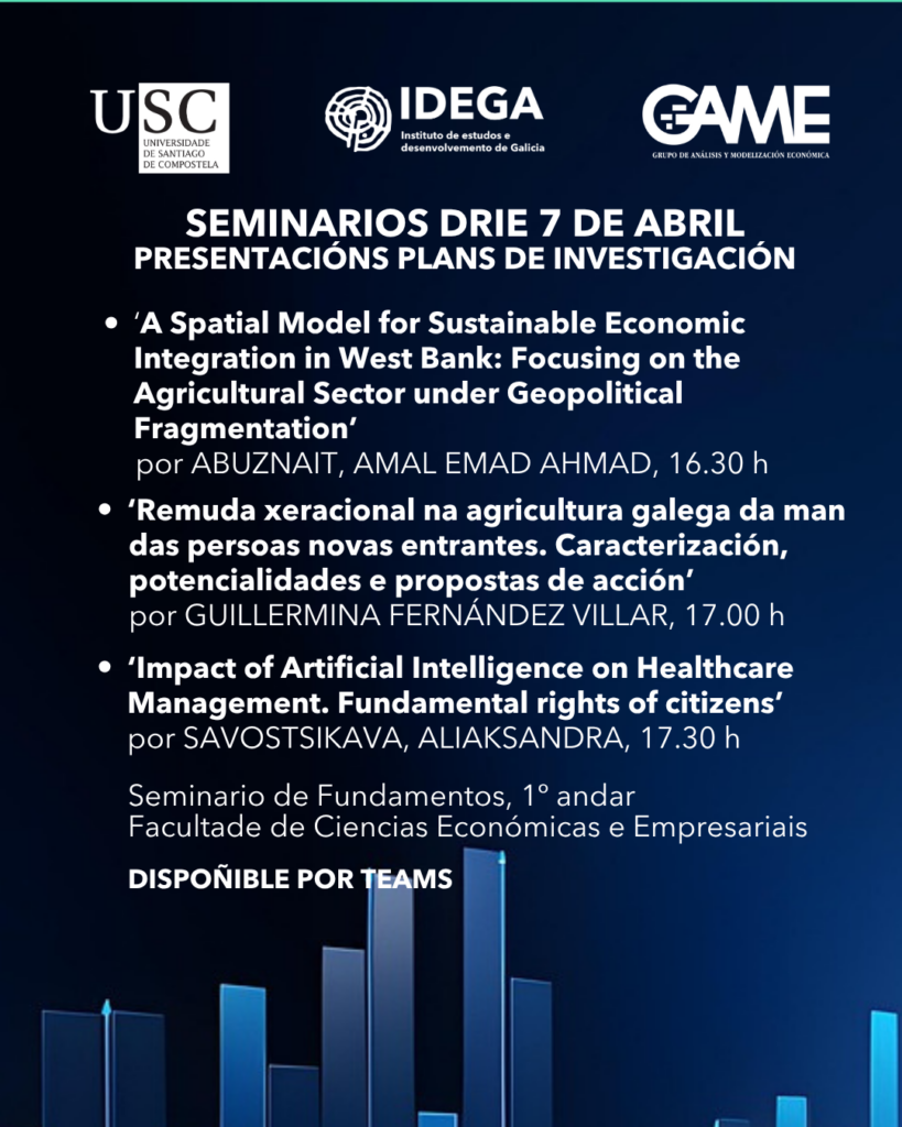 Terán lugar a partir das 16.30 h na Facultade de Ciencias Económicas e Empresariais da USC. Se non podes asistir de maneira presencial e queres participar por Teams, podes solicitar os datos de acceso á reunión no correo idega@usc.gal.